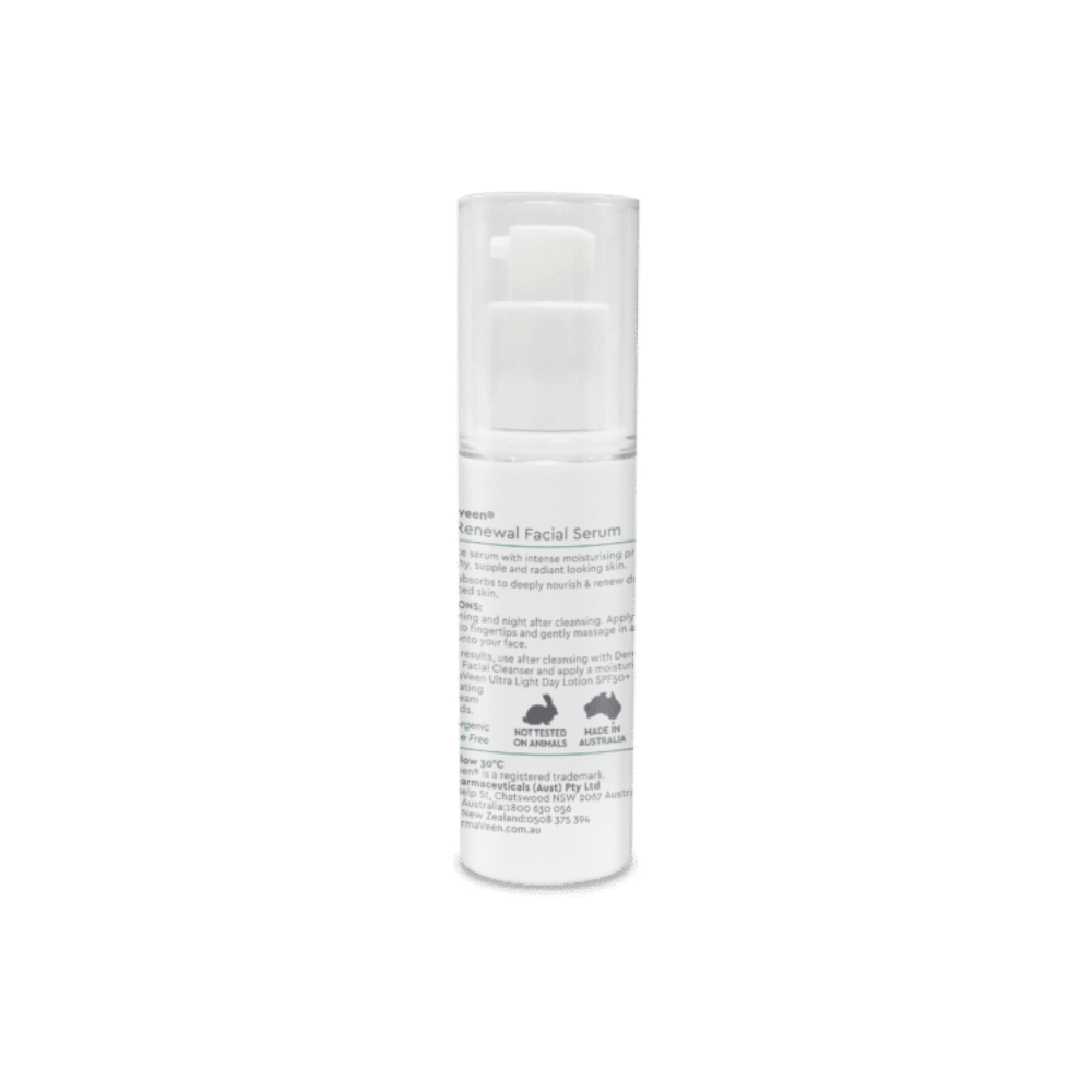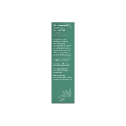 Created by nature proven by science. DermaVeen Skin Renewal Facial Serum is formulated with natural Colloidal Oatmeal to nourish and renew dry & sensitive skin. Enriched with Hyaluronic Acid, Pro-Vitamin B5 and Betaglucan to provide intense hydration. Free from fragrances & parabens, lanolin, artificial dyes and alcohol (Ethanol).