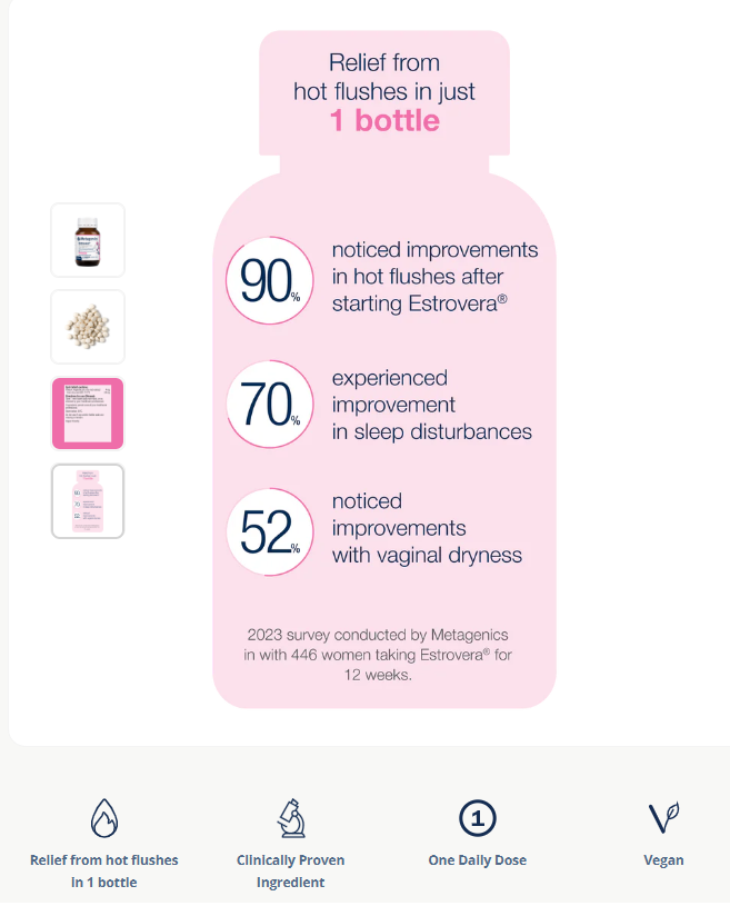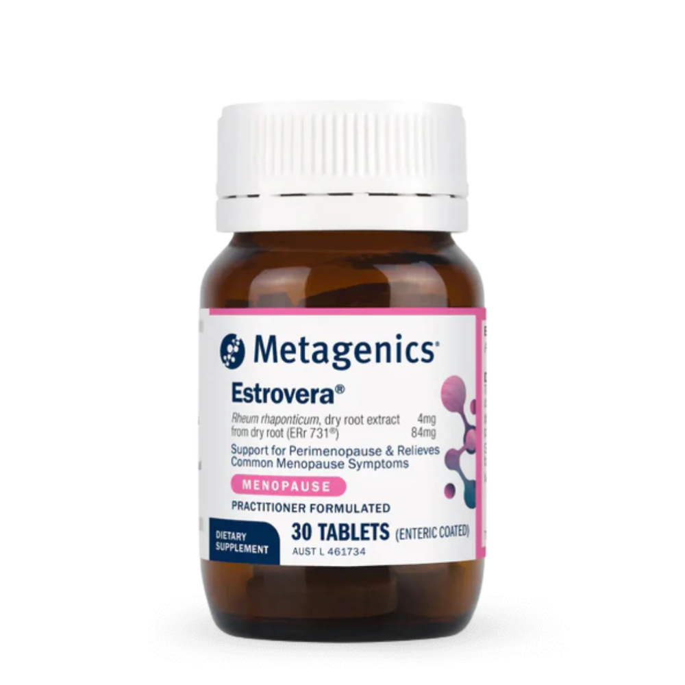 Metagenics Estrovera® is a plant-based supplement designed to relieve menopause and perimenopause symptoms with just one mini tablet daily. Formulated with ERr 731® (Siberian Rhubarb extract), it helps reduce hot flushes, irritability, fatigue, and sleep disturbances while supporting libido and joint health.